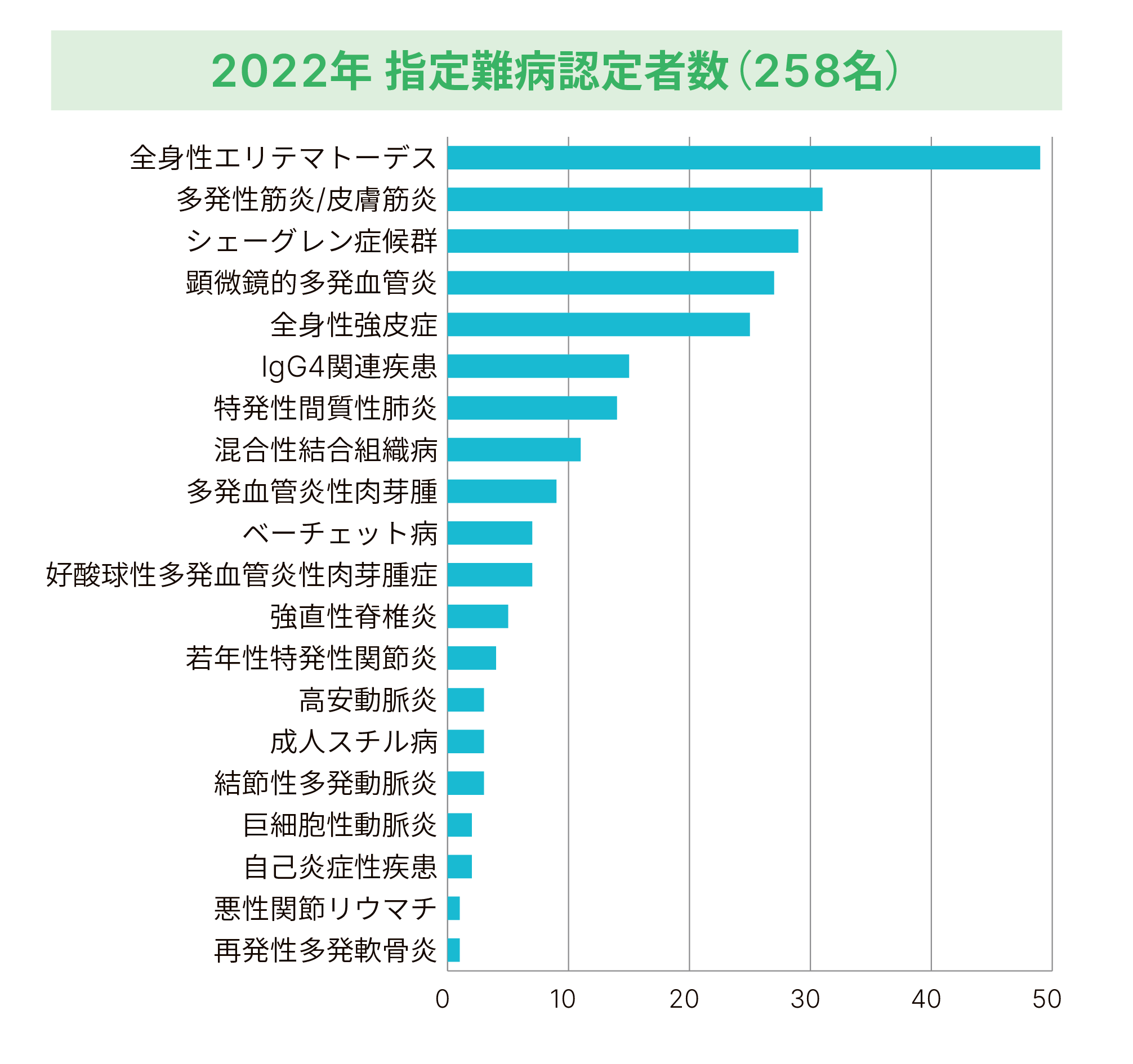 当院では患者の皆様からのニーズに応えるべく平成23年4月にリウマチ・膠原病センターを開設し、初代センター長に山村昌弘が就任しました。ステロイドや各種免疫抑制剤のほか、生物学的製剤の導入も積極的に進め、実績をあげてきています。併せて、当院腎臓病センターなどのスタッフとも緊密に連携し、現在、年間のべ約5000名の外来症例およびのべ約250例の入院症例を扱っています。