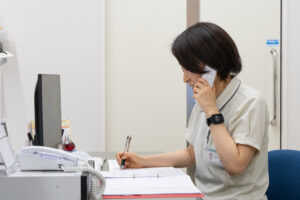 一日の記録を整理するほか、医師、看護師、リハビリ職など担当者と連絡を取り、連携を調整します。