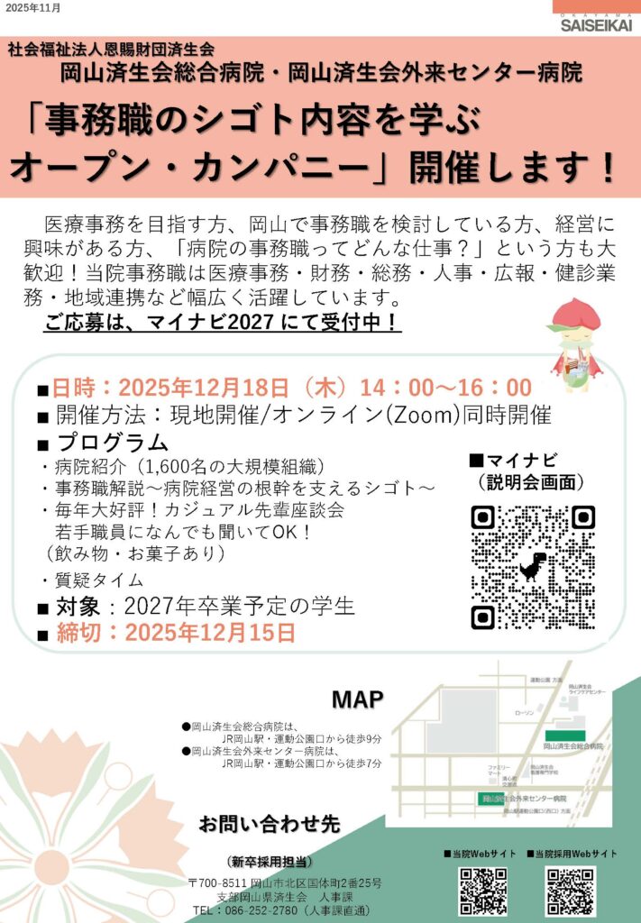 岡山済生会総合病院「事務職のシゴト内容を学ぶオープン・カンパニー」のお知らせ