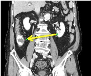 - CTで大腸内に造影剤の漏出がみられる(出血を表している)。
