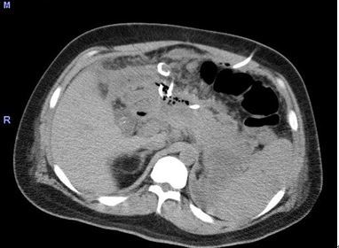 - 重症膵炎後の腹腔内膿瘍に対するCTガイド下ドレナージ。大きな膿瘍がみられている。