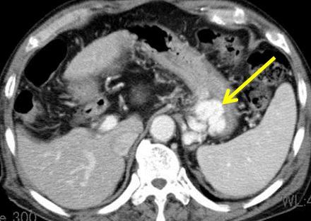 - 腹腔動脈造影。腫瘍濃染がみられる。