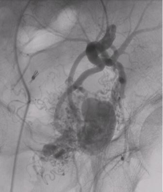 - 骨盤部の動脈造影。多数の異常血管がみられ著明に拡張した静脈が描出されている。