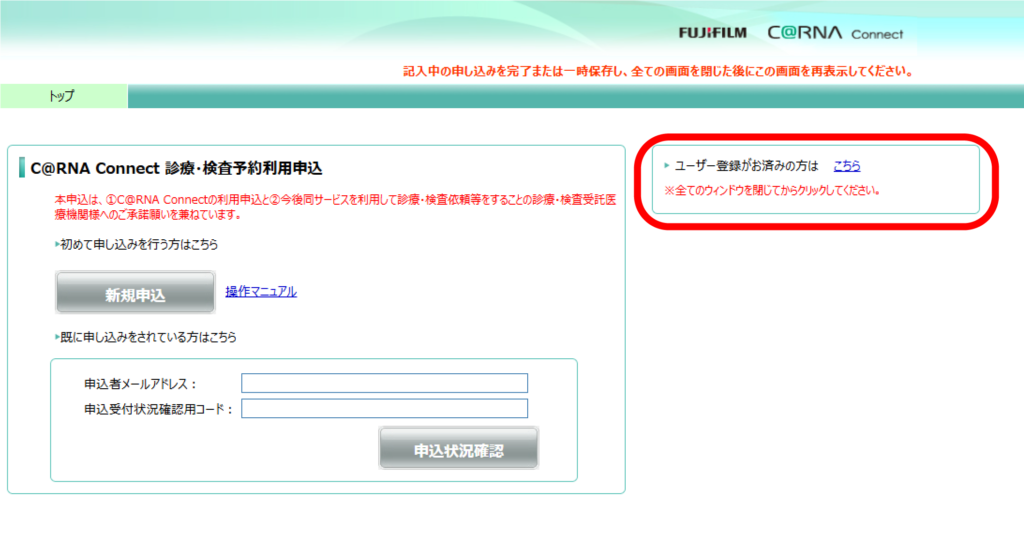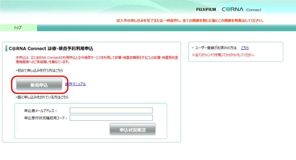 1.下記「オンライン利用申込」ボタンより「C@RNA Connect 診療・検査予約利用申込」へアクセス
