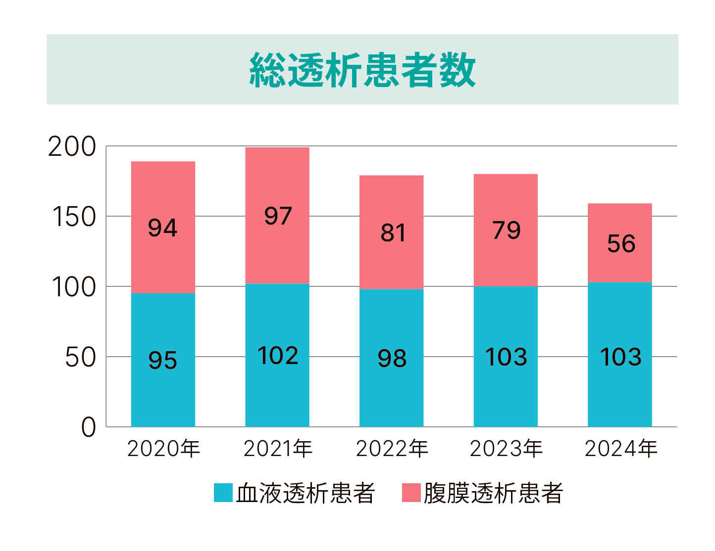 - 総透析患者数:血液透析 103名・腹膜透析 56名